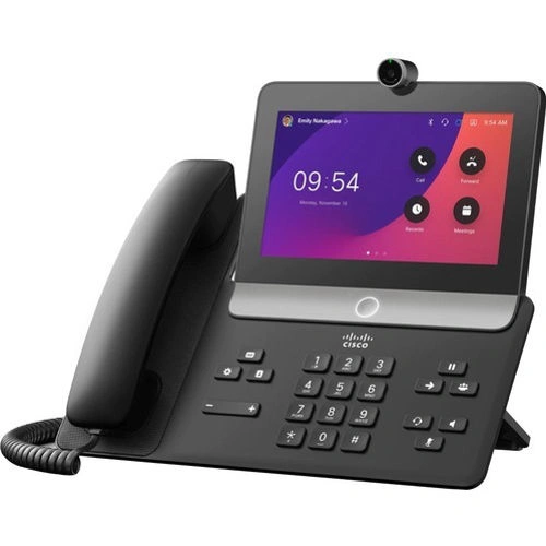 This Webex IP phone offers corded connectivity with Wi-Fi and Bluetooth support, providing versatile communication options for enterprise users.