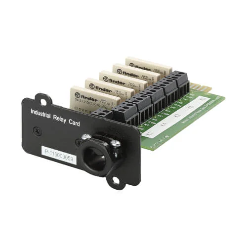 This industrial relay card enhances UPS functionality by enabling remote signaling, alarms, and integration with automation systems. It provides dry contact outputs that allow monitoring of UPS events in manufacturing, industrial, and commercial environments. Built to meet TAA compliance requirements, it is ideal for government and regulated sectors. Its rugged design ensures compatibility and long-term reliability in demanding installations.