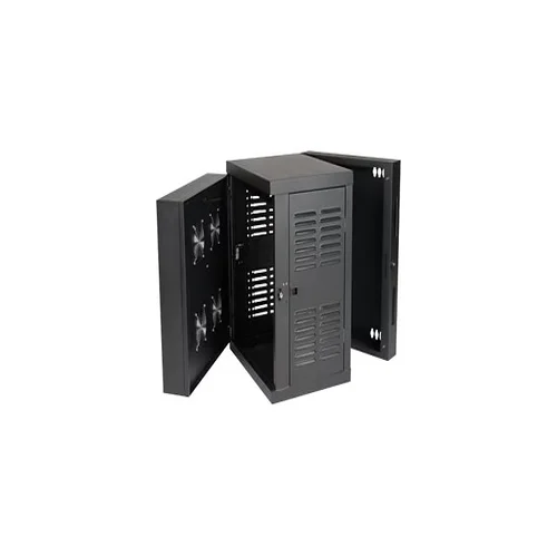 Compact 12U switch-depth wall-mount rack for secure and organized network equipment.