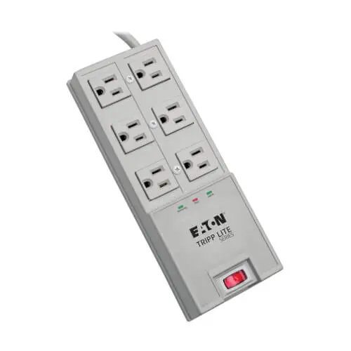 The Tripp Lite TR-6 by Eaton Protect It! 6-Outlet Surge Protector combines performance and durability to keep your electronics safe from sudden power fluctuations. With six protected outlets and a sturdy 6-foot (1.83 m) cord, it delivers both flexibility and strong surge suppression, making it an excellent choice for workstations, entertainment setups, and home offices.